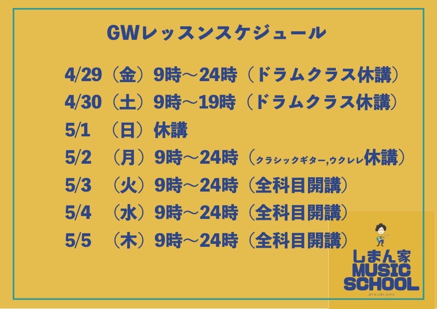 4/29(金)9時〜24時(ドラムクラスは休講)